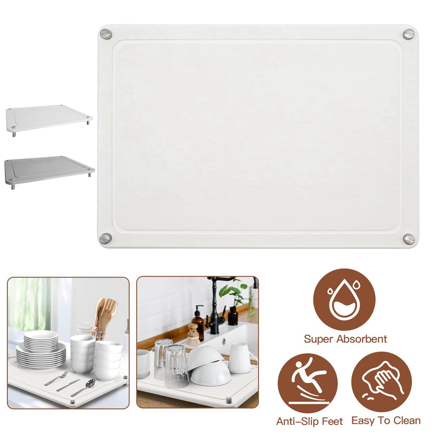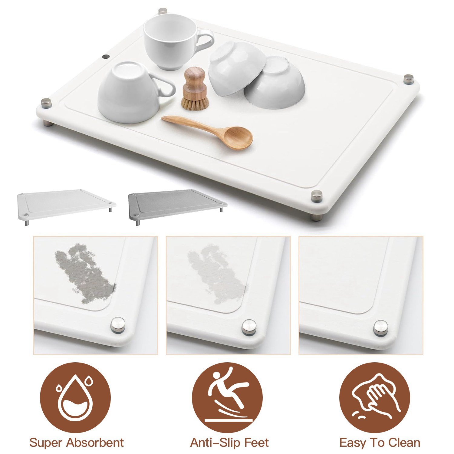 Your kitchen countertop is always wet and easy to get moldy? This instant dry dish drying mat is an absolute game-changer! It\'s super absorbent, great to absorb moisture and evaporate instantly with no water stains remain, which can keep your countertops clean, dry, and organized. Plus, extra stainless steel and raised feet ensure stability and excellent airflow. Perfect to use in the kitchen or bathroom to hold your tableware or toiletries. Easy to clean with warm water or included sanding pad.